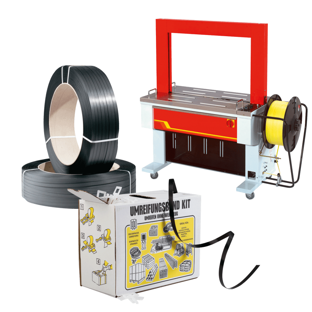 - PET-Umreifungen: Eignen sich für schwere Verpackungen und Paletten. Eine maschinelle und eine manuelle Verarbeitung ist möglich.
